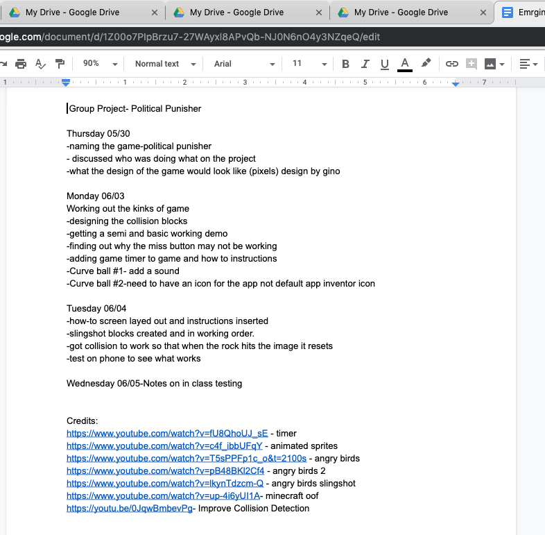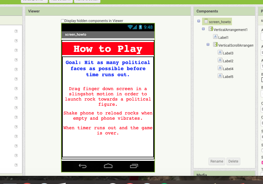As a group we have worked really hard and have created most of the app already and just need to work out some of the kinks such as the pictures displaying and the rock colliding with the political figures. Since, as some may already know I’m not very experienced in the creation of blocks in App Inventor so I have volunteered to do the How To screen and to write the comprehensive end paper explaining everything we did as a group. The How To screen will display the instructions for the game such as how to fling the rock or refill the ammo. It will also allow you to go back to the home screen so that you can begin the game.